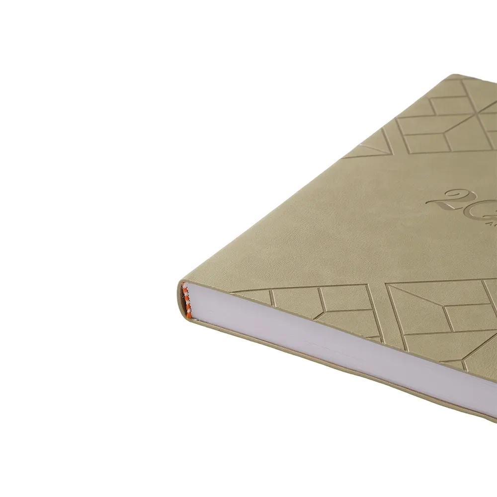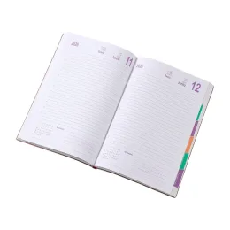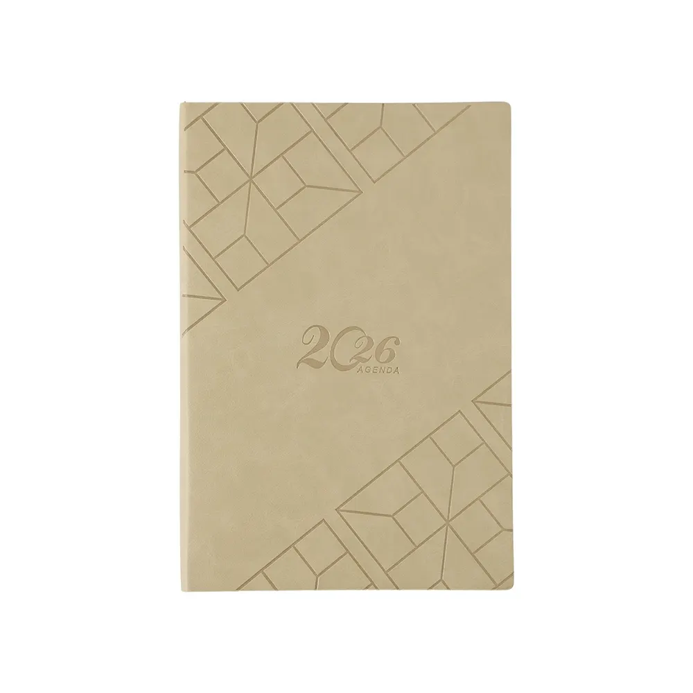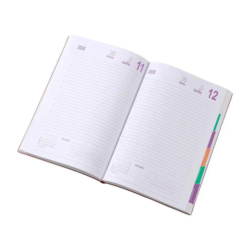Descrição: Agenda 2026 de couro sintético com abas mensais e marcador de página em cetim. Contém folhas para dados pessoais, calendários 2026 à 2028, planejamento 2026, DDI, página de conversões e páginas de contatos.