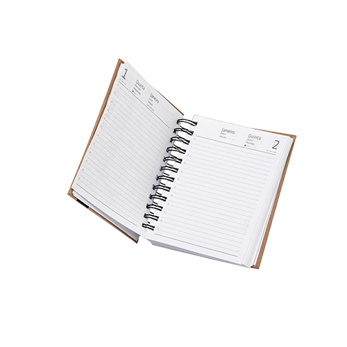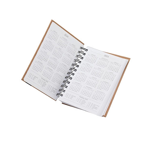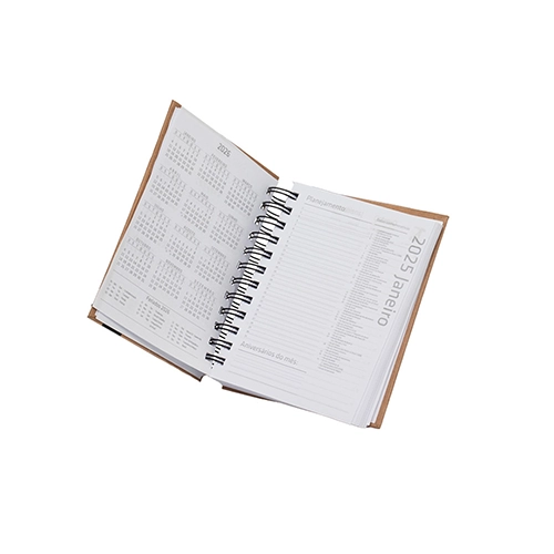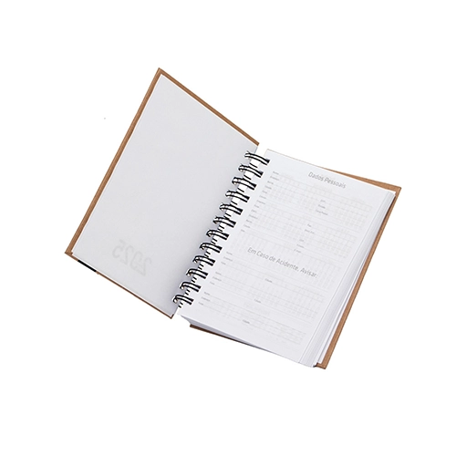 Descrição: Agenda diária 2025 com espiral, material kraft, capa dura. Contém aproximadamente 169 folhas, entre elas, páginas de dados pessoais, calendário 2024 a 2026, planejamento e aniversários do mês.