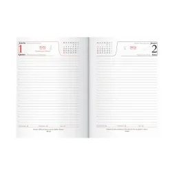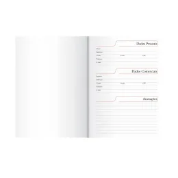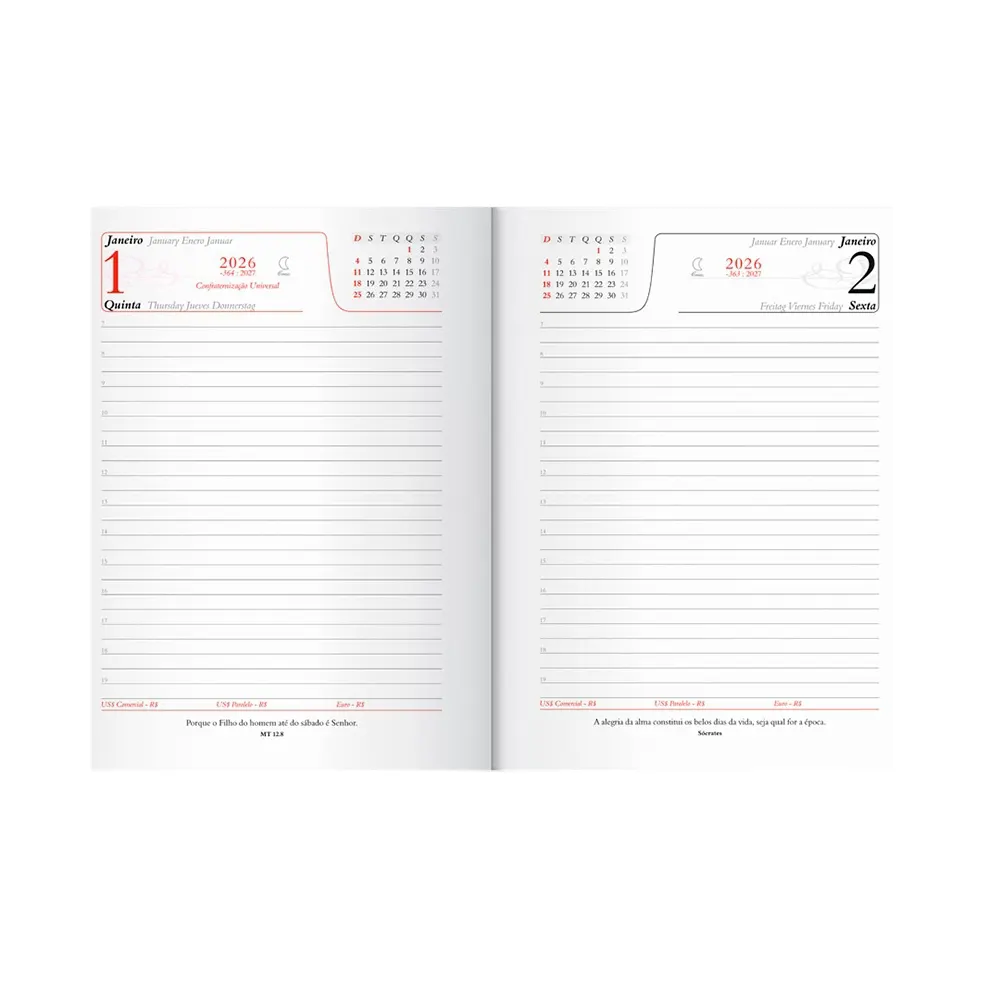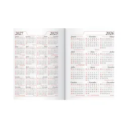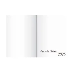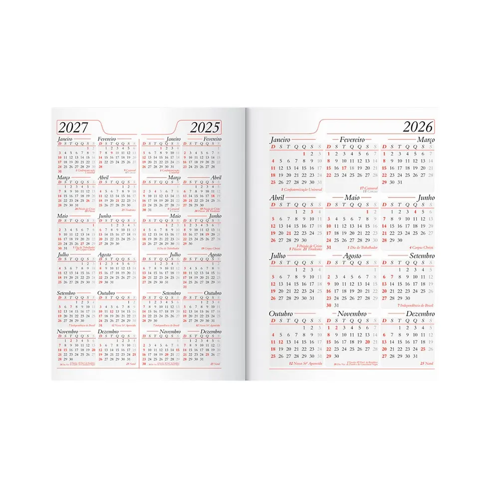 Descrição: Agenda diária 2026 com capa em couro sintético e marca-páginas em fita de cetim. Contém páginas dedicadas para dados pessoais, calendários de 2025 a 2027, lista de contatos, planejamento e mapas.