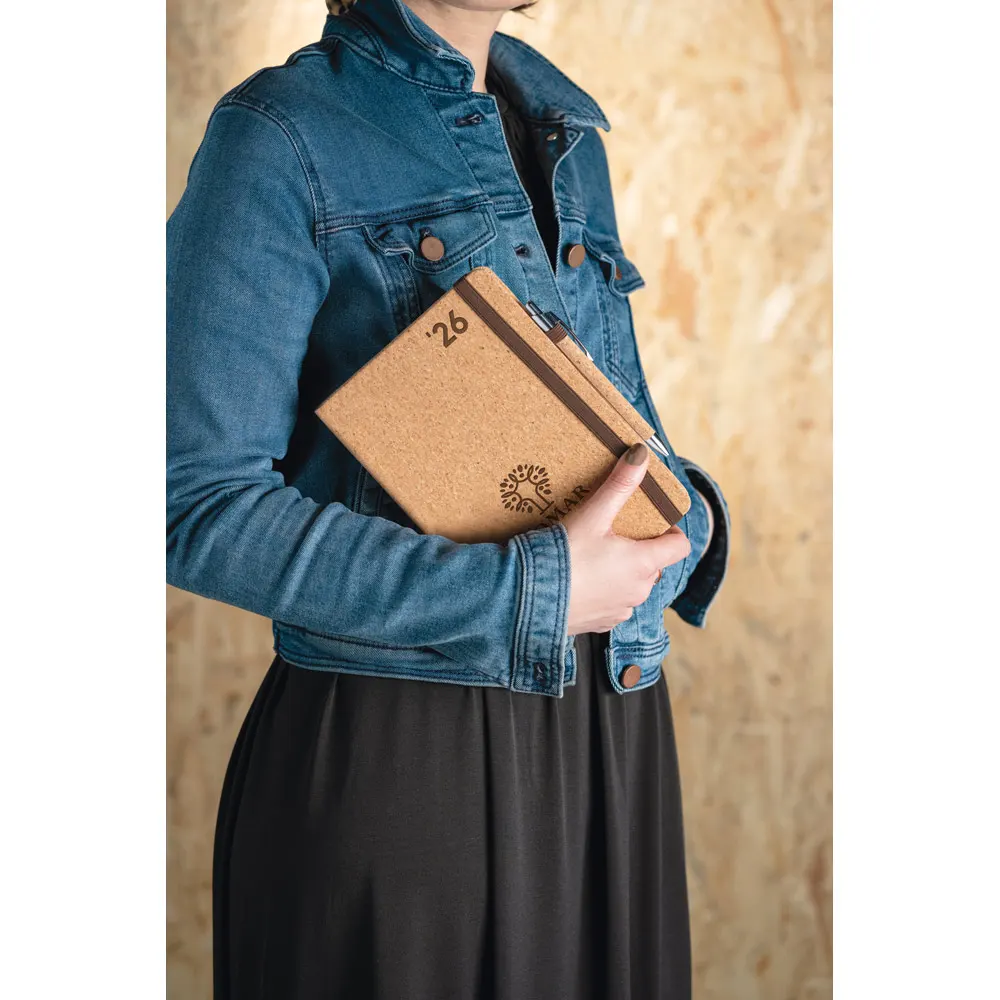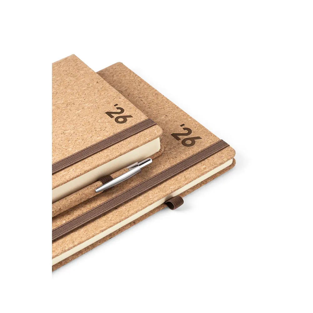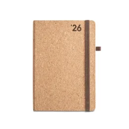 Agenda A5 em cortiça. Agenda com suporte para esferográfica e miolo em cor marfim. Fornecida em bolsa de non-woven. Esferográfica não inclusa. 148 x 210 mm | Bolsa: 205 x 250 mm