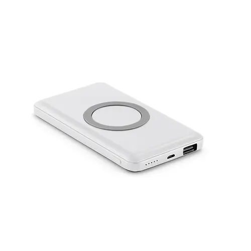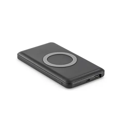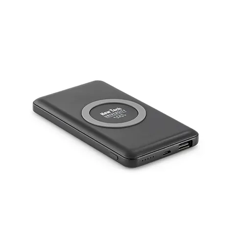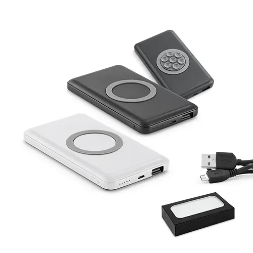 Bateria portátil e carregador wireless. Alumínio. Bateria polímero de lítio. LED: indicador de carga. Capacidade: 4.000 mAh. Entrada 5V/2A e saída 5V/2A. Potência de carregamento: 5W. Incluso cabo USB/micro USB para carregar a bateria. Fornecido em caixa presente. 126 x 71 x 14 mm