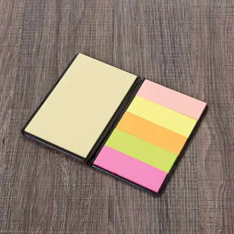 Possui cinco blocos coloridos autoadesivos com aproximadamente 25 folhas e bloco amarelo com aproximadamente 30 folhas.
