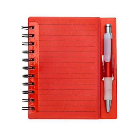Bloco de anotações com caneta e suporte para encaixe, bloco com wire-o e caneta plástica com detalhe emborrachado, carga esferográfica na cor azul e acionamento por clique.