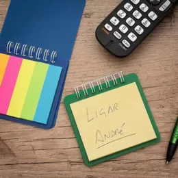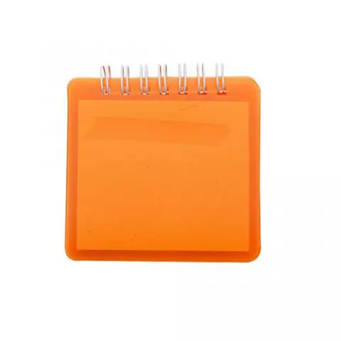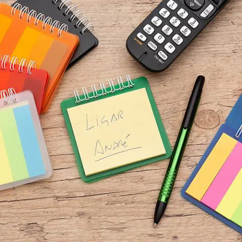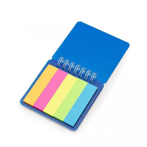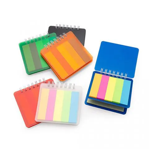 Descrição: Bloco de anotações plástico com autoadesivos. Bloco com wire-o branco, contém cinco blocos autoadesivos coloridos com aproximadamente 25 folhas cada e bloco amarelo com aproximadamente 25 folhas.