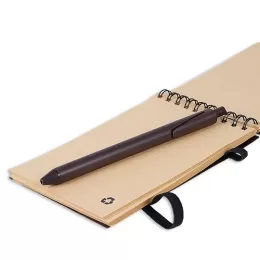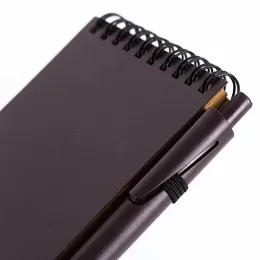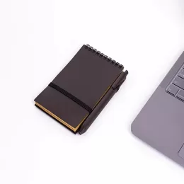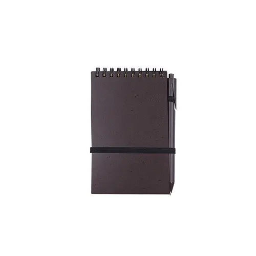 Descrição: Bloco de anotações ecológico com caneta plástica: Bloco de anotações com elástico e suporte para caneta, produzido com grãos de café e polipropileno, aproximadamente 60 folhas marrons sem pauta, caneta plástica com acionamento por clique.