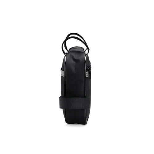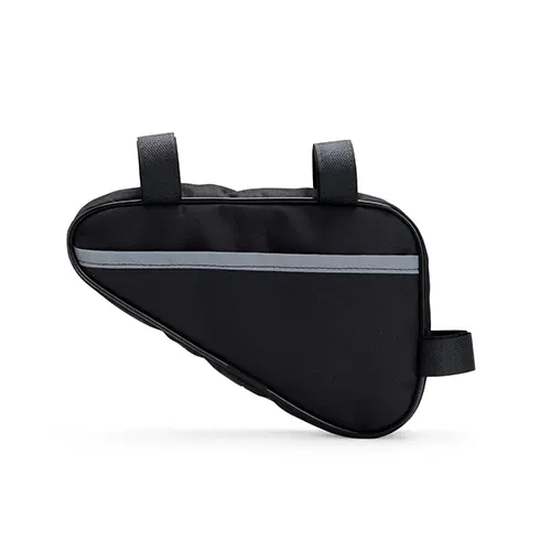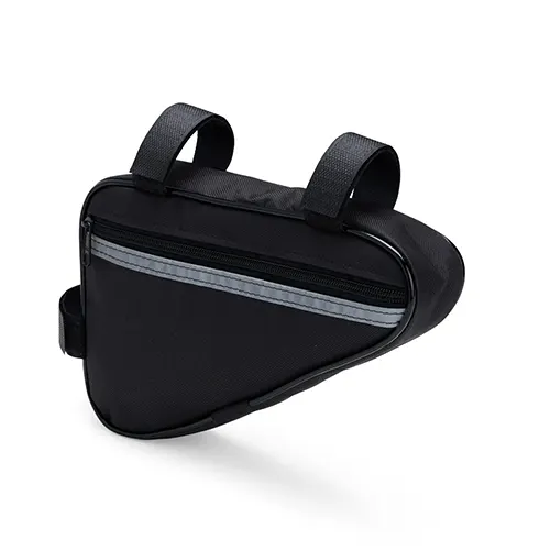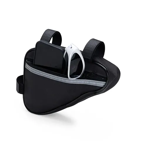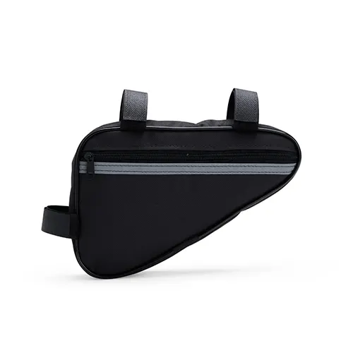 Descrição: Esta bolsa para quadro é uma opção prática para carregar objetos enquanto estiver andando de bicicleta. Confeccionada em Oxford resistente e impermeável, a bolsa conta com único compartimento com fechamento em zíper, o que a torna ideal para armazenar objetos menores de forma eficiente, protegendo todo o conteúdo de seu interior contra a chuva e respingos dágua durante o trajeto. Conta com uma tira refletiva costurada para maior visibilidade no trânsito, além de alças de nylon com fechamento em velcro de fácil ajuste para o encaixe correto no quadro da bicicleta.