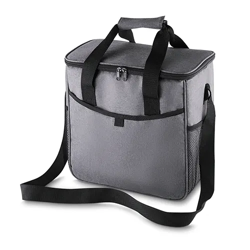 Descrição: Bolsa térmica 16 litros confeccionada em nylon e poliéster. Possui bolso frontal, bolsos laterais de malha, alça de mão com pegador cinza de velcro e alça ajustável para as costas.