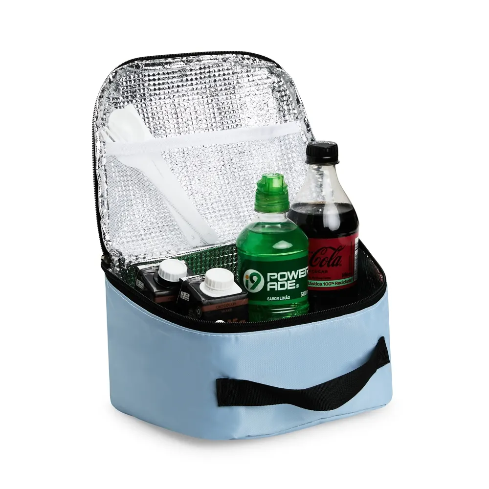 Descrição: Bolsa térmica em sarja impermeável, com fechamento em zíper e capacidade máxima de 6 litros. Conta com bolso interno em tela de nylon e revestimento térmico em folha de alumínio. Além disso, possui uma pequena placa costurada feita em couro sintético e alça de nylon para transporte.