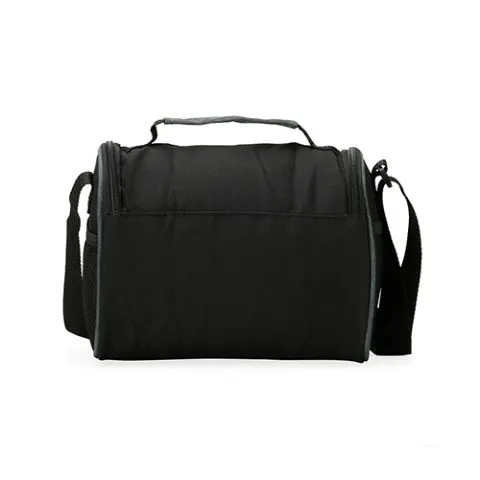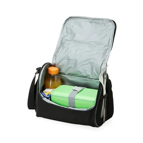 Descrição: Bolsa térmica de poliéster com dois compartimentos, capacidade de 7 litros. A bolsa possui revestimento térmico em PEVA atóxico, alça de mão, bolsos laterais telados e alça transversal.