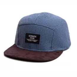 Boné five panel, aba reta, confeccionado em jeans eco, aba em suede. Frontal revestida com entretela inteligente, estampa frontal em patch silkado aplicado no bordado, ajustador snapback.