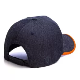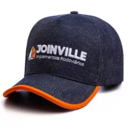 Boné modelo americano, aba curva, confeccionado em jeans. Frontal revestida com entretela inteligente, sanduíche na aba, bordado frontal em 3d, ajustador em fivela de metal niquelada.