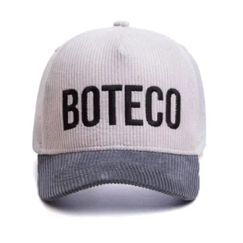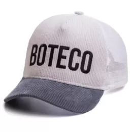 Boné trucker, aba curva, confeccionado em veludo+tela. Frontal revestida com entretela inteligente, estampa frontal bordada, ajustador em fivela de metal prata velha.
