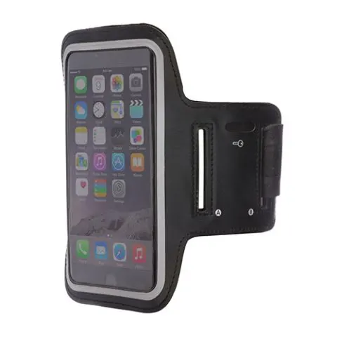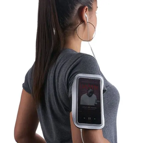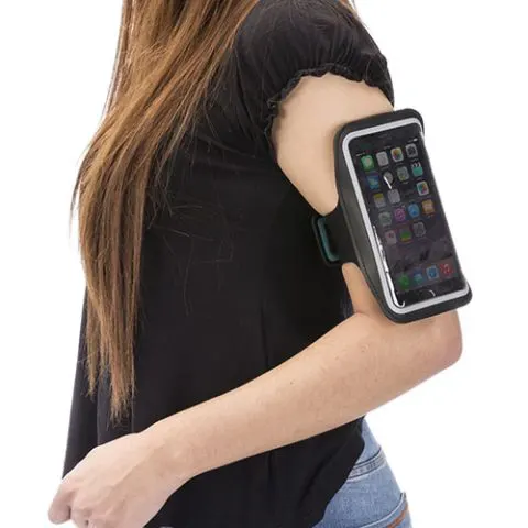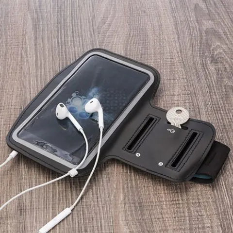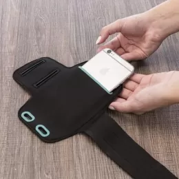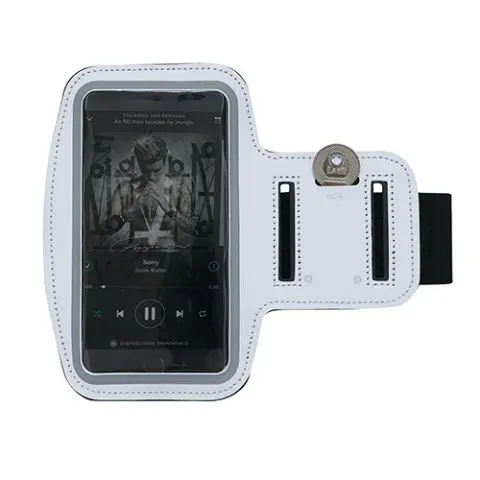 Descrição: Braçadeira de neoprene com detalhe frontal em couro sintético. Visor plástico e contorno prata, possui “bolso” para chave, “cinta” de velcro regulável com posição indicativa na lateral(A e B). Possui contorno azulado no velcro, parte traseira possui 4 áreas vazadas para poder passar o fone de ouvido(também possuem contorno azulado).