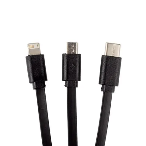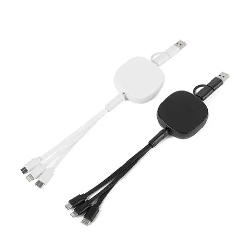 Descrição: Cabo USB retrátil com acabamento em Bambu. Contém entradas Lightning/iPhone, V8/Android e Tipo-C/Android, USB e USBC. Suporte com rolamento e trava automática. Suporte com frente lisa e parte traseira com área para aplicação de adesivo ou etiqueta resinada.