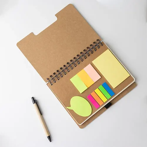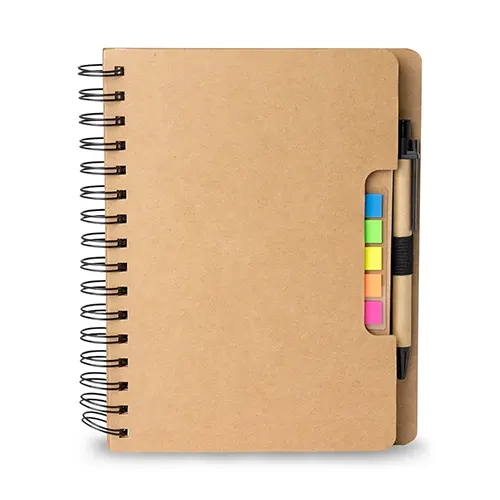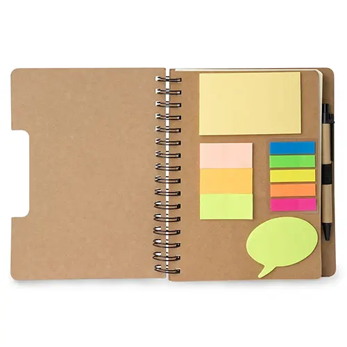 Caderneta ecológica com autoadesivos e caneta, com capa produzida em papelão kraft. Contém miolo com aproximadamente 70 folhas pautadas, suporte de nylon acompanhando, caneta de papelão com clip e ponteira de plástico com carga esferográfica 1.0mm e acionamento por clique. Bloco autoadesivo amarelo com aproximadamente 20 folhas, bloco verde com aproximadamente 20 folhas, cinco blocos coloridos autoadesivos com aproximadamente 20 folhas, 3 blocos coloridos com aproximadamente 20 folhas.