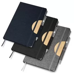 Descrição: Caderneta com capa dura em RPET (PET Reciclado) com suporte para celular. Possui elástico para lacre, marcador de página em cetim, porta caneta e detalhe na área de personalização em bambu. Contém aproximadamente 80 folhas com pauta.(Não acompanha caneta)