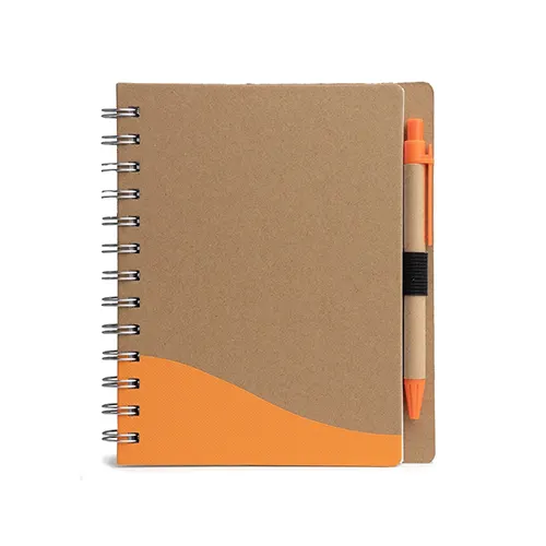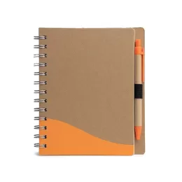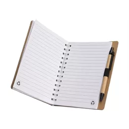 Caderneta ecológica com caneta, capa produzida em papelão com detalhe texturizado e verso liso. Contém miolo com aproximadamente 70 folhas pautadas, suporte de nylon e acompanha caneta de papelão com clip e ponteira de plástico, carga esferográfica 1.0mm e acionamento por clique.