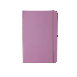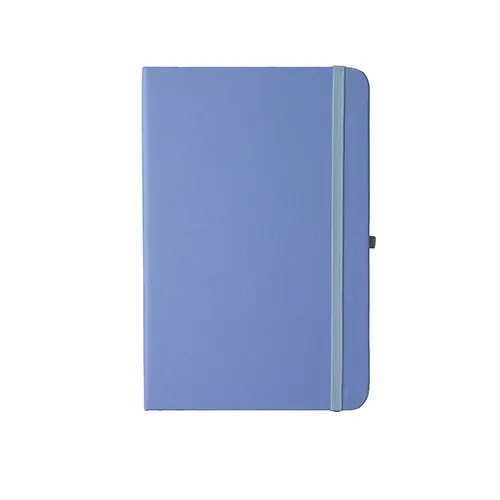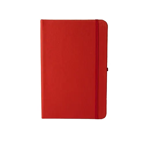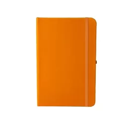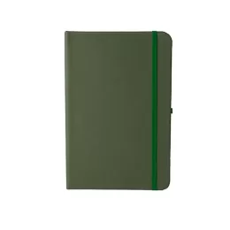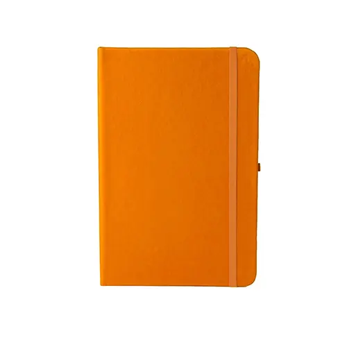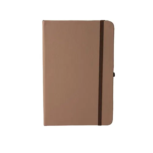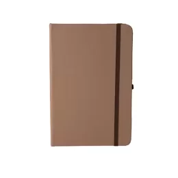 Caderneta em couro sintético com porta caneta, marcador de página em cetim e fita elástica para lacre. Contém aproximadamente 80 folhas pardas com pauta.