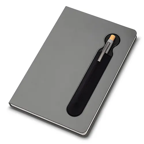 Descrição: Caderneta emborrachada com suporte para caneta em tecido e capa em PU. Contém aproximadamente 80 folhas pautadas. OBS: NÃO ACOMPANHA CANETA.