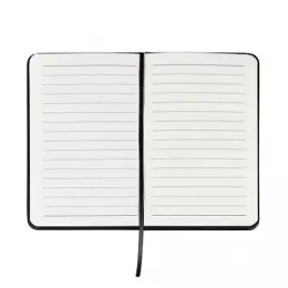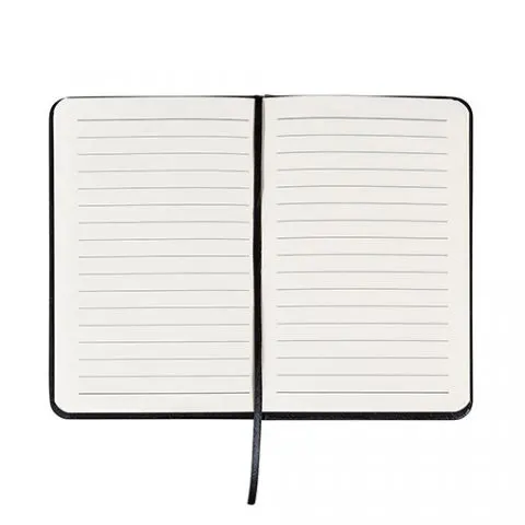 Descrição: Caderneta tipo moleskine emborrachado com marcador de página em cetim e fita elástica para fechar. Contém aproximadamente 80 folhas amareladas com pauta.