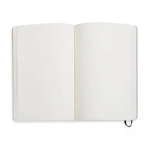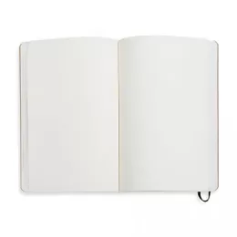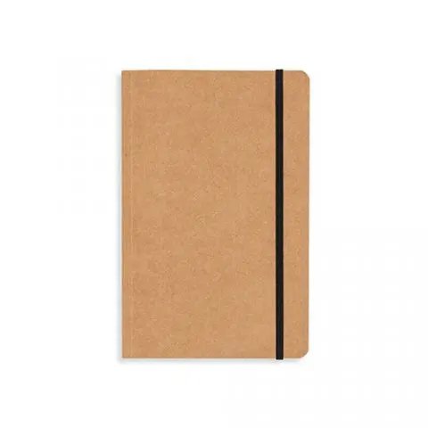 Descrição: Caderneta tipo moleskine em material kraft, frente e verso liso com fita elástica para fechar. Contém aproximadamente 80 folhas amareladas sem pauta.
