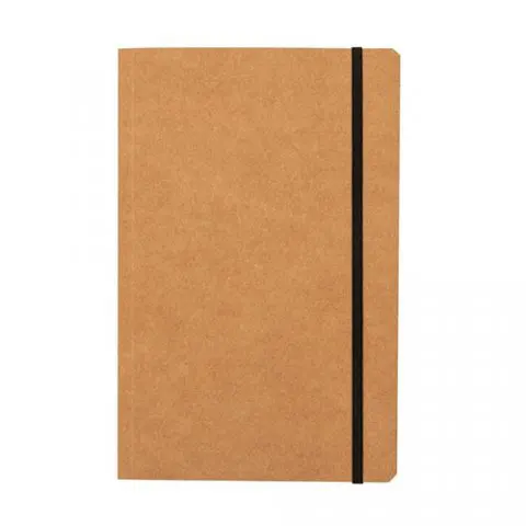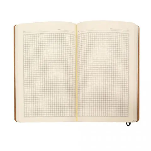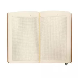 Descrição: Caderneta tipo moleskine com páginas quadriculadas, produzido em material kraft com frente e verso liso e fita elástica para fechar. Contém aproximadamente 80 folhas amareladas quadriculadas.
