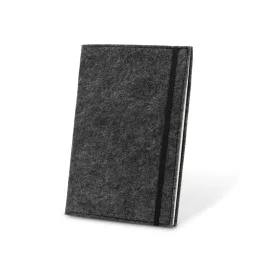 Caderno A5 de capa dura, ideal para personalização em sublimação. O caderno em 300D poliéster 100% reciclado (rPET) tem 160 páginas pautadas em papel 100% reciclado cor de marfim, uma fita separadora, um suporte para esferográfica (não inclusa) e um elástico para fecho do bloco. 143 x 211 mm