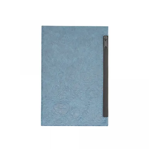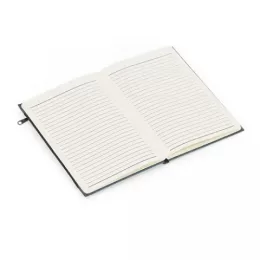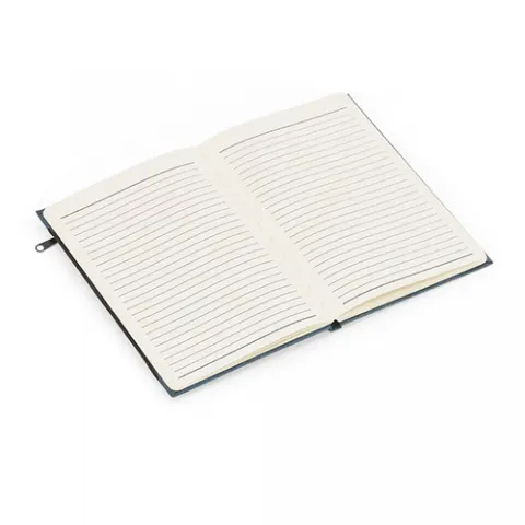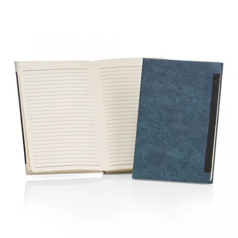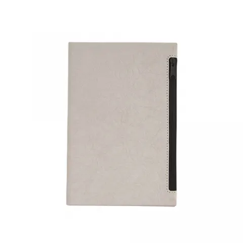 Caderno de anotações com porta objetos na capa, capa dura em material sintetico, miolo 80 folhas pautadas na cor bege.