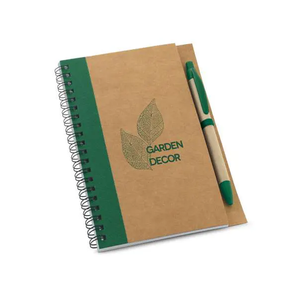 Papel kraft. Com 60 folhas não pautadas de papel reciclado. Incluso esferográfica. 130 x 177 mm