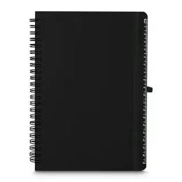Caderno de anotações em PP(Polipropileno) reciclável com suporte para caneta e miolo de 70 folhas brancas pautadas.