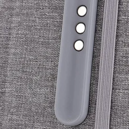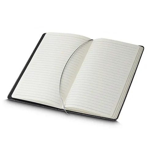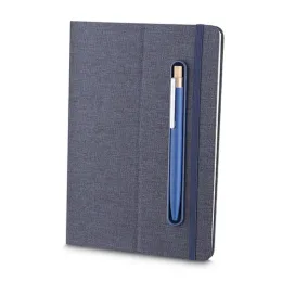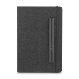 Caderno produzido com capa em tecido RPET e suporte para caneta na capa, capa dobrável para suporte de smartphone, miolo com 80 folhas pautadas.