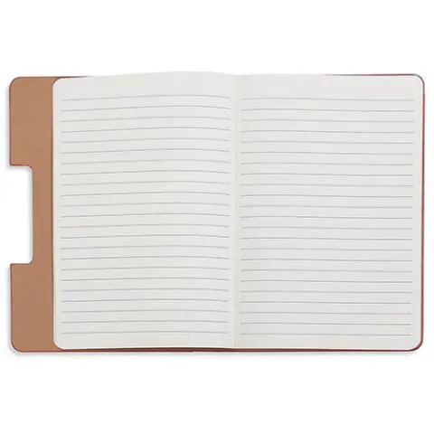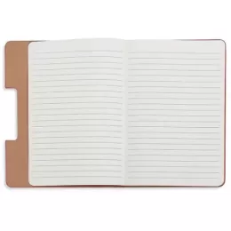 Descrição: Caderno produzido em couro sintético com autoadesivos. Capa interna com cinco bloquinhos autoadesivos coloridos com aproximadamente 25 folhas cada e bloco com aproximadamente 80 folhas pardas pautadas.