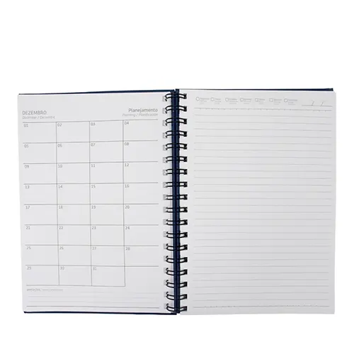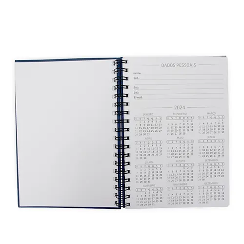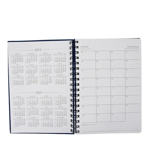 Descrição: Caderno com capa em cromato e wire-o metálico. Possui aproximadamente 86 folhas pautadas e páginas para: dados pessoais, calendários de 2023 à 2025, planejamentos e endereços de contatos.