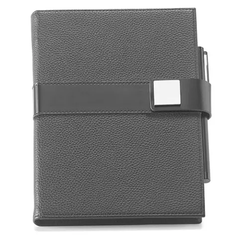 O EMPIRE é um caderno A5 de design moderno, minimalista e com toque business. A capa rígida em polipele protege o seu interior que, de forma inteligente, se divide em três partes distintas com um separador que permite identificar cada uma das partes. As suas 120 folhas dividem-se proporcionalmente por folhas não pautadas, pautadas e pontilhadas. O seu design minimalista é complementado pelo detalhe metálico no fecho, característico desta linha de produtos e que reforça a sua elegância. Produto fornecido com suporte de esferográfica (não inclusa) e em caixa presente. 150 x 210 mm | Caixa: 197 x 250 x 28 mm