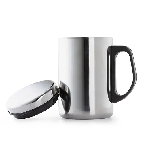 Descrição: Caneca de 350ml inox com parede dupla, possui tampa com vedação e pegador plástico (não é térmica).