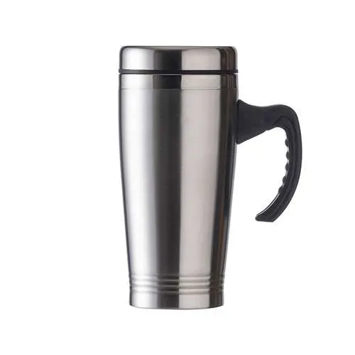 Caneca inox de 450ml, pegador de plástico e parte interna em inox. Possui tampa com compartimento que pode ser aberto para beber(não é térmica).