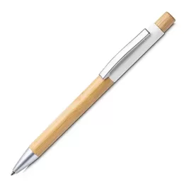 Caneta em alumínio reciclado com detalhe em bambu e acabamento similar à borracha. Possui carga esferográfica azul 1.0 mm e acionamento por clique.