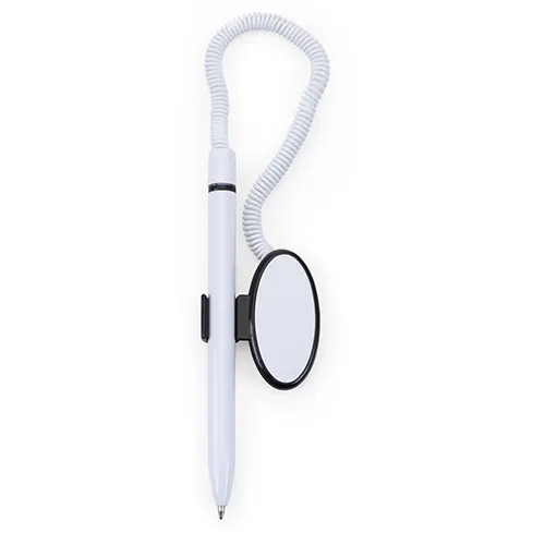 Descrição: Caneta balcão plástica inteira branca com anel colorido. Possui suporte oval com traseira de adesivo auto-colante.