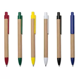 Descrição: Caneta ecológica de papelão com detalhes coloridos. Além do amplo espaço para personalização no clip, o mesmo pode facilmente ser retirado para personalização no corpo da caneta. Clip e ponteira plástica, aciona por clique.