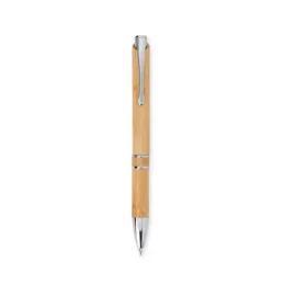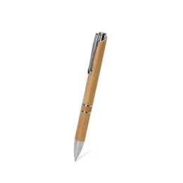 Descrição: A nossa caneta ecológica de bambu é a opção perfeita para acompanhar uma rotina repleta de registros. Com um design elegante, ela conta com clipe metálico, carga esferográfica azul de 1.0mm e acionamento por clique, unindo praticidade e sustentabilidade. Para torná-la ainda mais exclusiva, acompanha um estojo de papel com estampa que imita bambu.