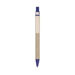 Caneta ecológica de papelão com detalhes coloridos. Clip de madeira e ponteira plástica, possui relevo na ponteira. Aciona por clique.
