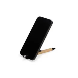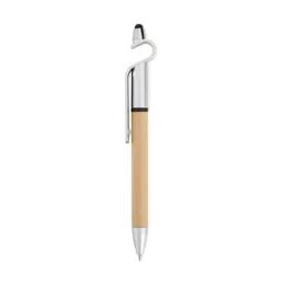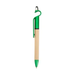 Descrição: Caneta de papelão com detalhes plásticos, contém suporte para celular e touch screen. Carga esferográfica azul e acionamento por rotação.