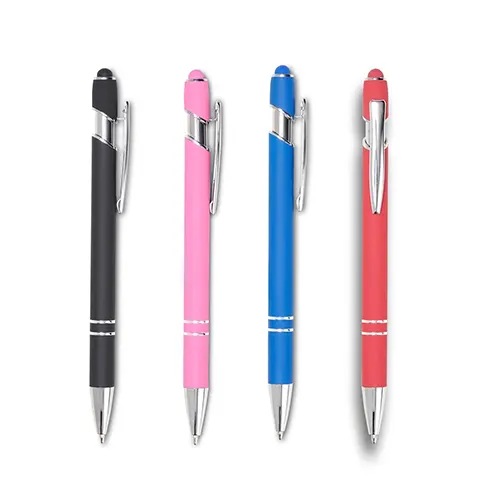 Descrição: Caneta touch screen metálica com acabamento inteiramente emborrachado, carga esferográfica azul e acionamento por clique.