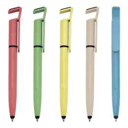 Descrição: Caneta fibra de bambu touch com suporte para celular. Clip aberto utilizado como suporte para o celular e parte superior com limpador de tela. Aciona por giro, carga esferográfica na cor azul.