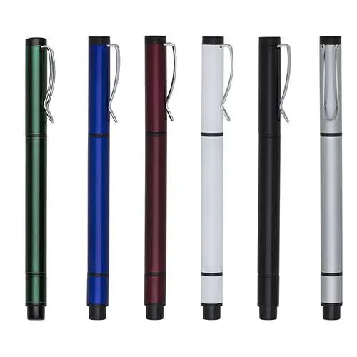 Caneta metal marca texto inteira colorida com detalhes preto. Clip de metal na cor prata, possui tampa em ambos lados (esferográfica e marca texto). Marca texto apenas amarelo.