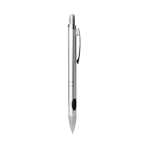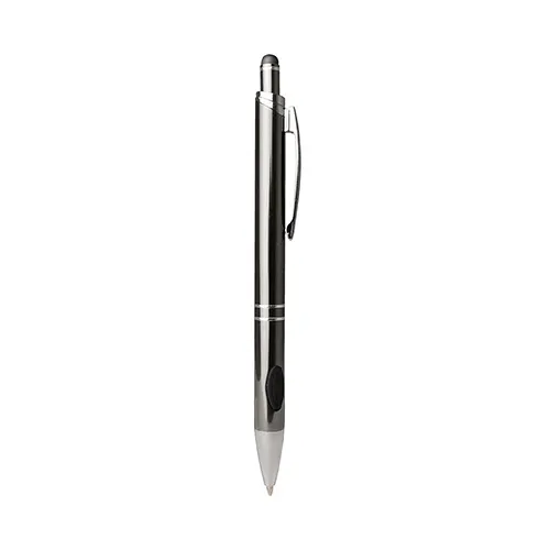 Caneta metálica com touchscreen, com detalhe emborrachado na parte inferior, carga esferográfica azul de 1.0 mm e acionamento por clique.