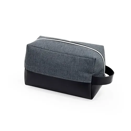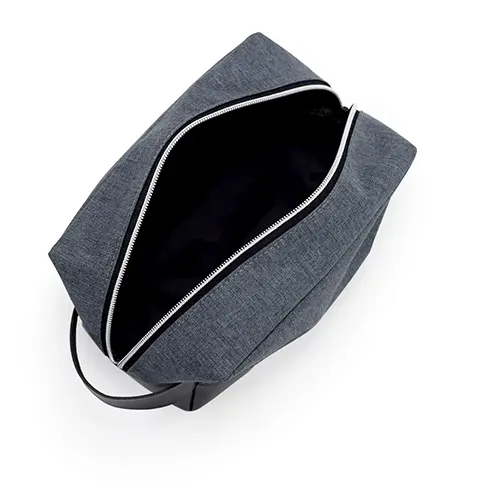Nécessaire confeccionada em nylon com detalhes em couro sintético, parte interna contém forro de poliéster.