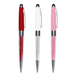 Descrição: Caneta metálica com touch screen e detalhes em cristal, carga esferográfica azul e acionamento por rotação.