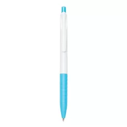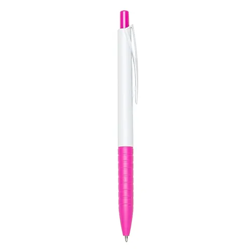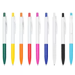 Descrição: Caneta plástica branca com detalhes coloridos. Clip plástico com detalhe vazado nas laterais, acionador e parte inferior colorida com oito anéis em relevo. Aciona por clique.
