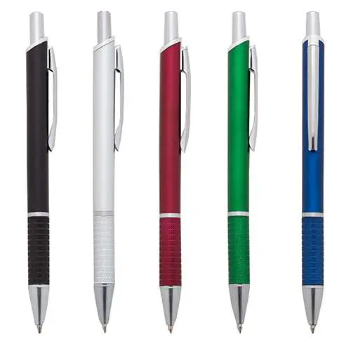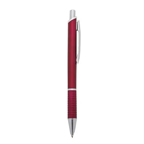 Caneta plástica fosca inteira colorida com detalhes prata. Clip de metal, anel prata e parte inferior da caneta possui detalhes com relevo, aciona por clique.